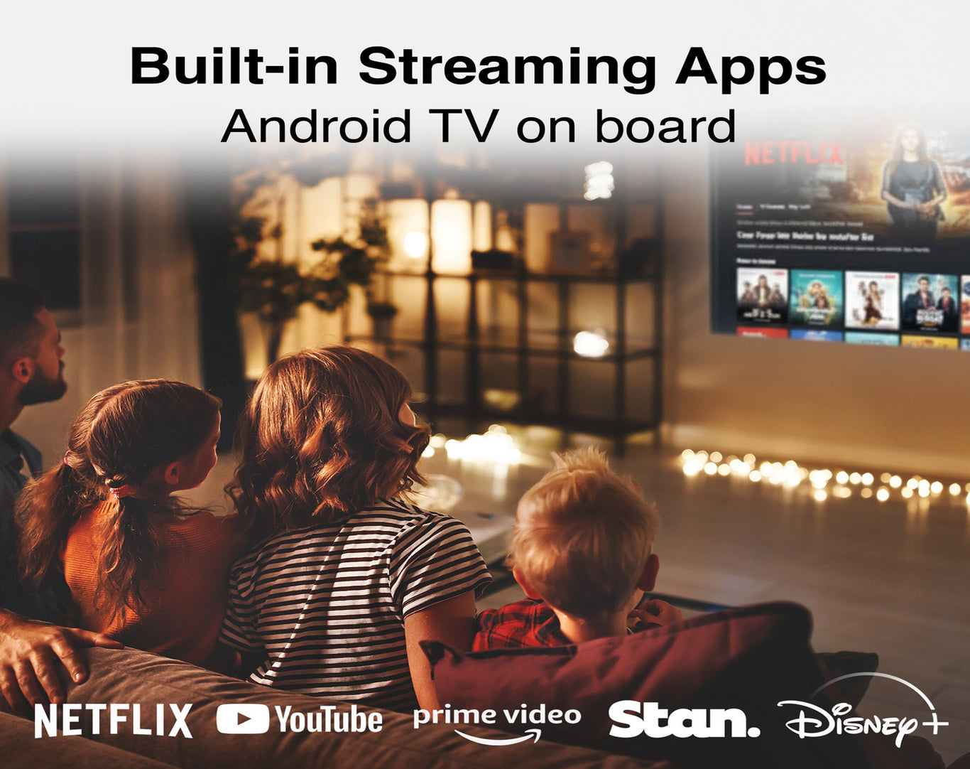 Android TV Built-In – Stream your favourite content from Netflix, YouTube, Disney+, and more* without needing extra devices.